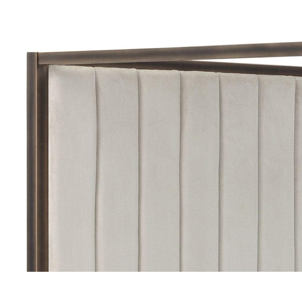With its majestic design, this timeless bed showcases an exquisite canopy frame that will undeniably enhance the allure of any bedroom. It is adorned with our premium piccolo processo performance fabric, accentuated by vertical tufting on the headboard. The bed is complemented by a charming rustic bronze iron frame. No need for a box spring as it comes with slats. The performance fabric is resistant to moisture, long-lasting, and effortless to maintain.