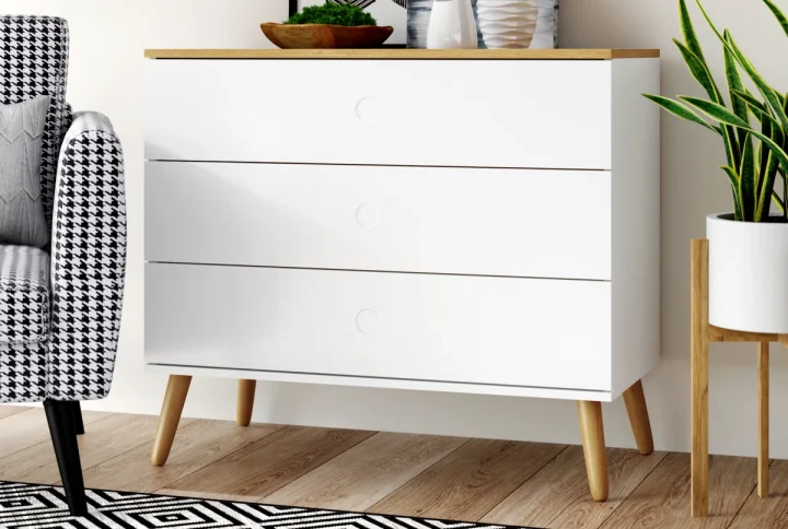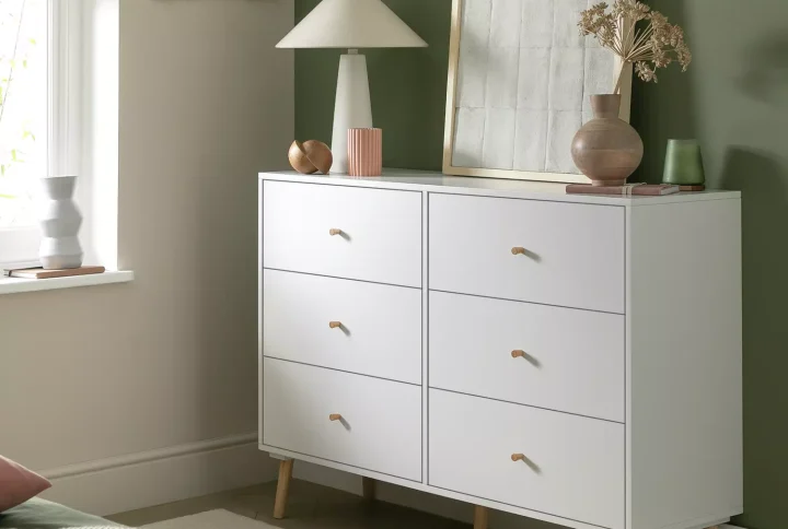 FSM Wide 6 Drawers of Chest Storage Organizer is a modern double dresser that offers a great oversized storage solution for your bedroom, living room, or hallway. It has a spacious top that can display your lamps, photos, paintings, bouquets, and more, and six large drawers that can store and sort your clothes, books, toys, and other items. It is made of high quality MDF that is durable and long-lasting. It has smooth metal slides that make it easy to open the drawers even with heavy items.