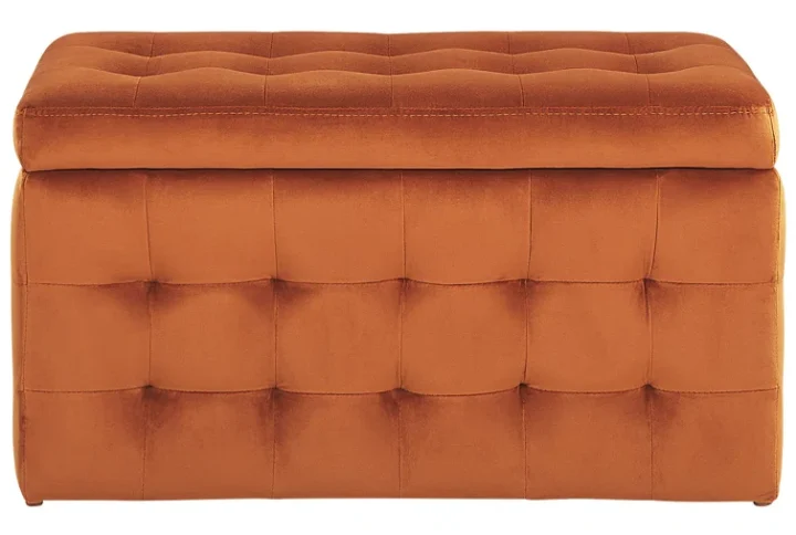 Transform an underutilized corner of your home or enhance your living room with an inviting seating option that perfectly balances style and functionality. This storage ottoman boasts a vintage-inspired design, featuring elegant golden legs and flared arms, all covered in a luxurious matte velvet fabic. The cleverly designed hinged lid opens to unveil ample storage space, ideal for stowing away clothing, linens, books, and other essentials. Whether you’re seeking a chic place to put your feet up after a long day or a stylish update to your decor, this ottoman is a perfect blend of comfort and practicality.