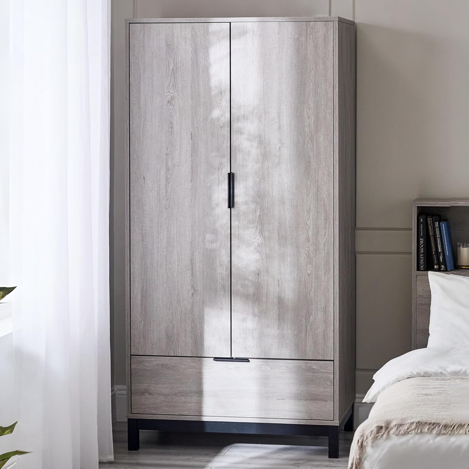 Experience the benefits of a well-organized space with the Julian Bowen Bali 2-Door Single Drawer Grey Oak Wardrobe. Featuring innovative click furniture technology, this wardrobe merges stylish design with easy assembly. Its contemporary grey oak finish, paired with striking black legs and handles, imparts a classic industrial aesthetic to your bedroom – providing you with a sophisticated interior that requires minimal maintenance. Boasting remarkable storage capabilities, smart features, and a timeless design, this wardrobe will not only turn your bedroom into a serene retreat but also enhance your overall living environment.