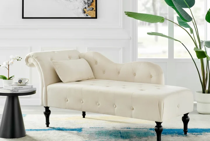 Enhance your living area with this exquisitely stylish chaise lounge. Its sleek and fluid design, featuring a gently curved arm and back, evokes a mid-century modern aesthetic. The straight black wooden legs contribute to a lighter appearance of the structure. This piece will enhance any contemporary living room or spacious bedroom. Take a moment to relax in this plush chaise, covered in a soft fabric.