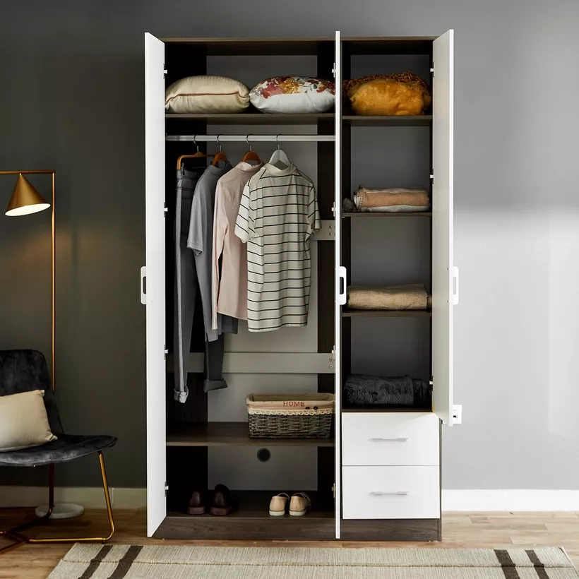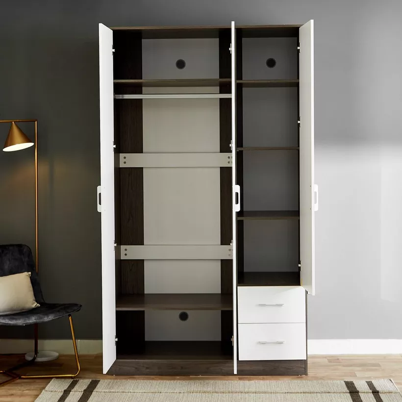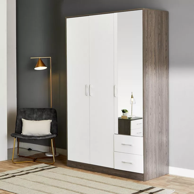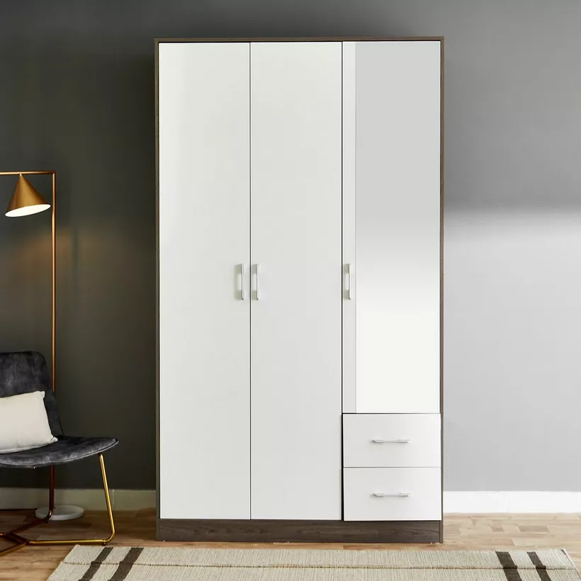 Create a modern style in your space with an offering of a wardrobe. It features three doors for storage, one of which has a mirror, and is built with engineered wood to ensure durability. Furthermore, this strong wardrobe is scratch and stain-resistant due to the melamine finish that requires only occasional wiping for maintenance.